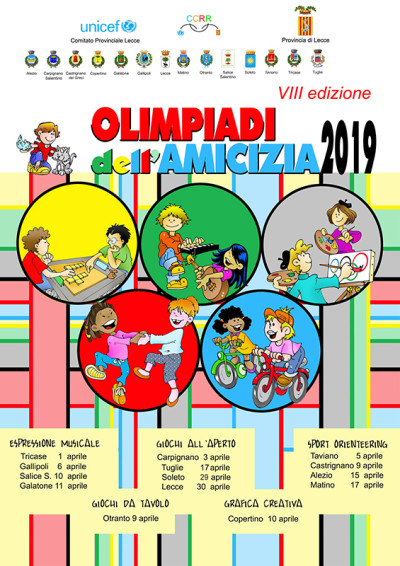 Tornano, per l'ottava edizione, le "Olimpiadi dell'Amicizia", un'occasione di incontro, gioco e confronto per i giovanissimi del Salento, tra partecipazione e creatività. L’evento nasce grazie alla collaborazione di 14 consigli comunali dei ragazzi, di consigli comunali degli adulti e delle scuole di Alezio, Carpignano Salentino, Castrignano dei Greci, Copertino, Galatone, Gallipoli, Lecce, Matino, Otranto, Salice Salentino, Soleto, Taviano, Tricase, Tuglie. Richiamando la simbologia dei cerchi della bandiera olimpica, le attività previste sono 5 e riguardano 1) espressione musicale, 2) grafica creativa 3) sport- orienteering 4) giochi all’aperto e 5) giochi da tavolo.